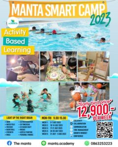 The Manta Swim School คือโรงเรียนสอนว่ายน้ำสำหรับเด็กที่ออกแบบคลาสเรียนให้เหมาะกับพัฒนาการของแต่ละช่วงวัย โดยทีมครูผู้เชี่ยวชาญ พร้อมสระว่ายน้ำระบบเกลือที่ควบคุมอุณหภูมิ เหมาะสำหรับเด็กเล็ก เราให้ความสำคัญกับความปลอดภัย ความเข้าใจ และการเรียนรู้อย่างสนุกสนาน